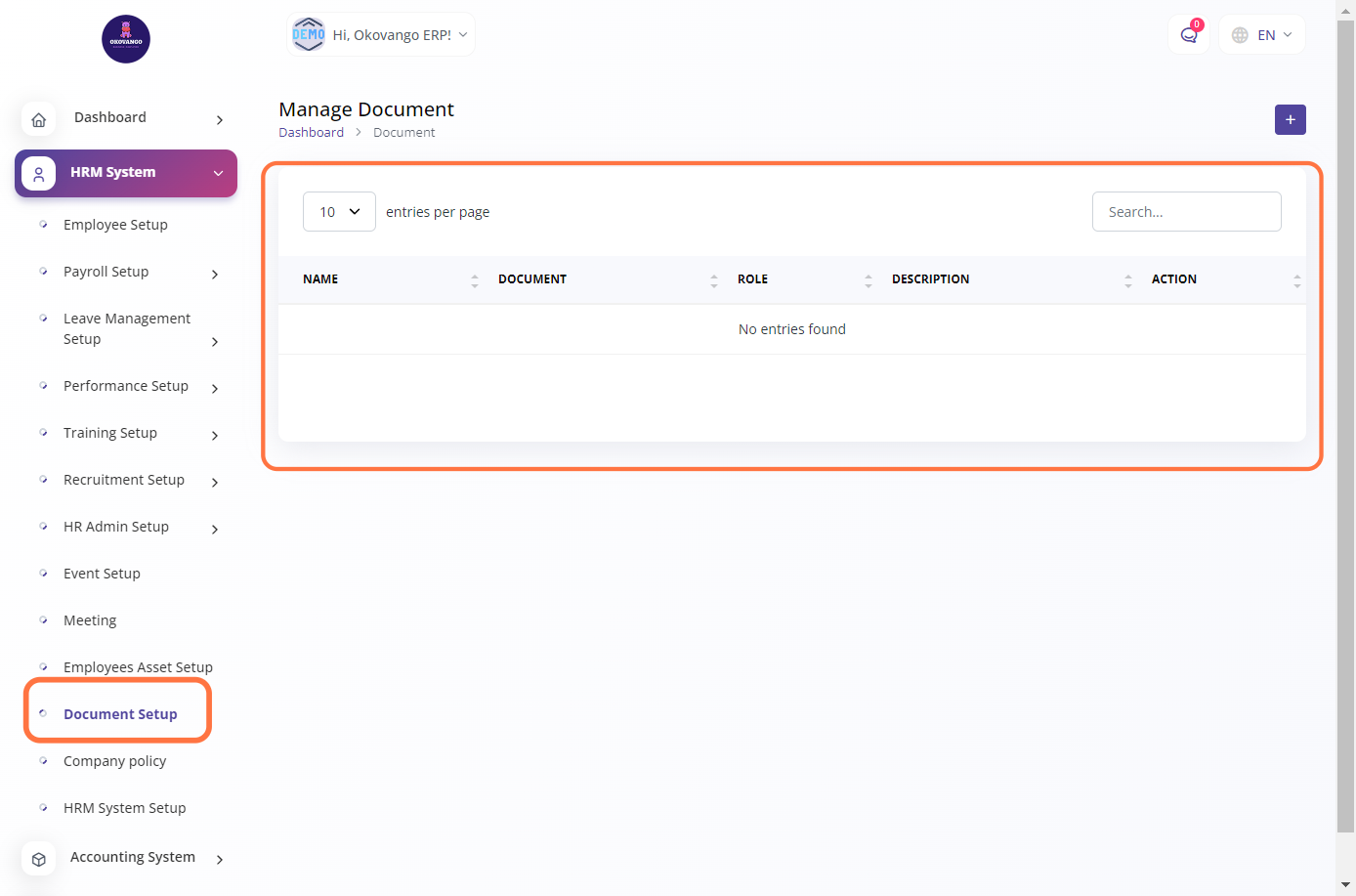 You can set up and configure document templates and formats specific to your organization. This functionality allows you to create standardized document templates for various purposes, such as contracts, agreements, reports, or any other relevant documents used within your organization. By setting up the document setup, you can define the structure, layout, and content placeholders for each document type, ensuring consistency and efficiency in document creation and management.