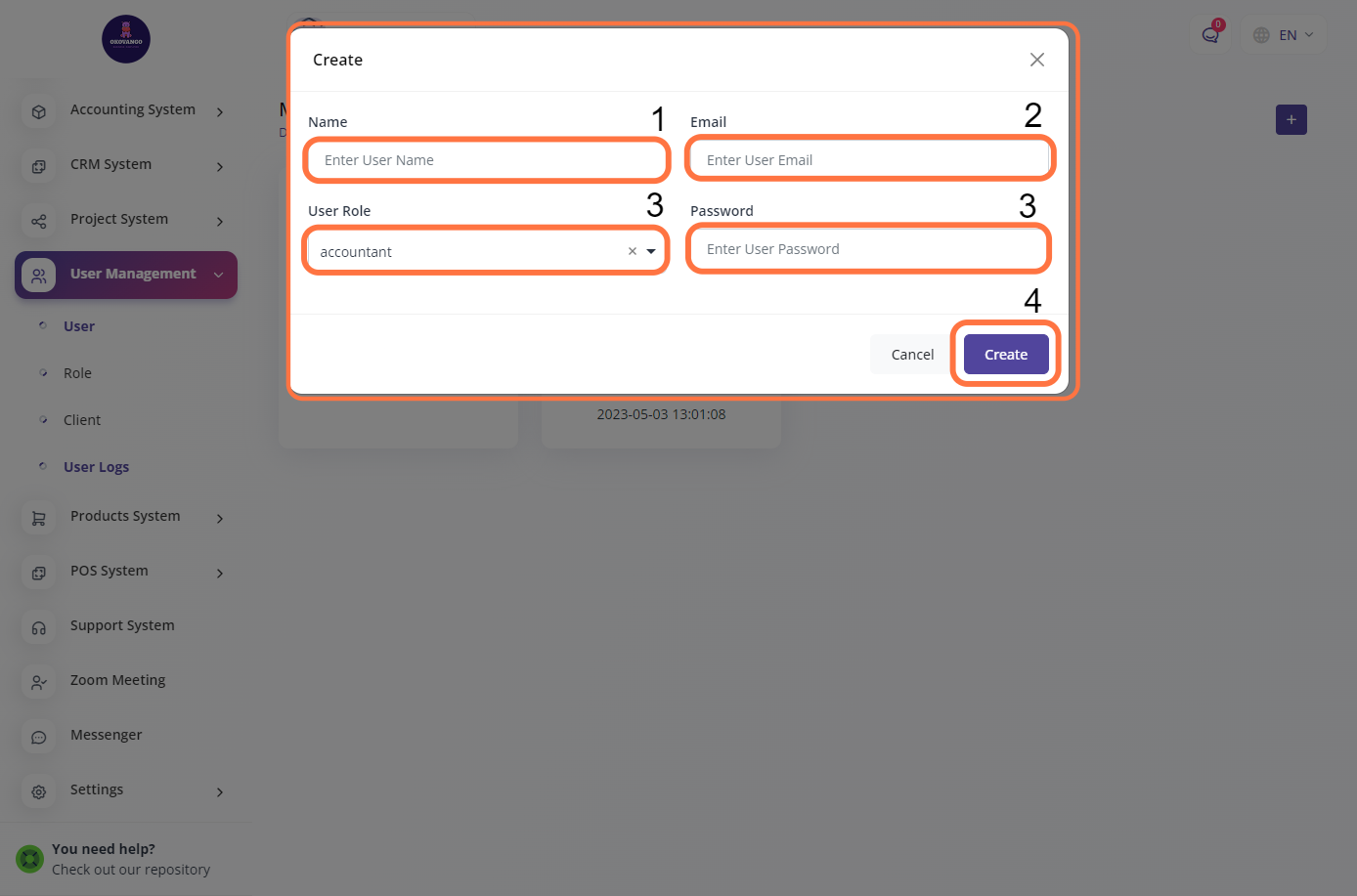 After clicking the create button, you can proceed to set up users in the ERP system by following these steps: