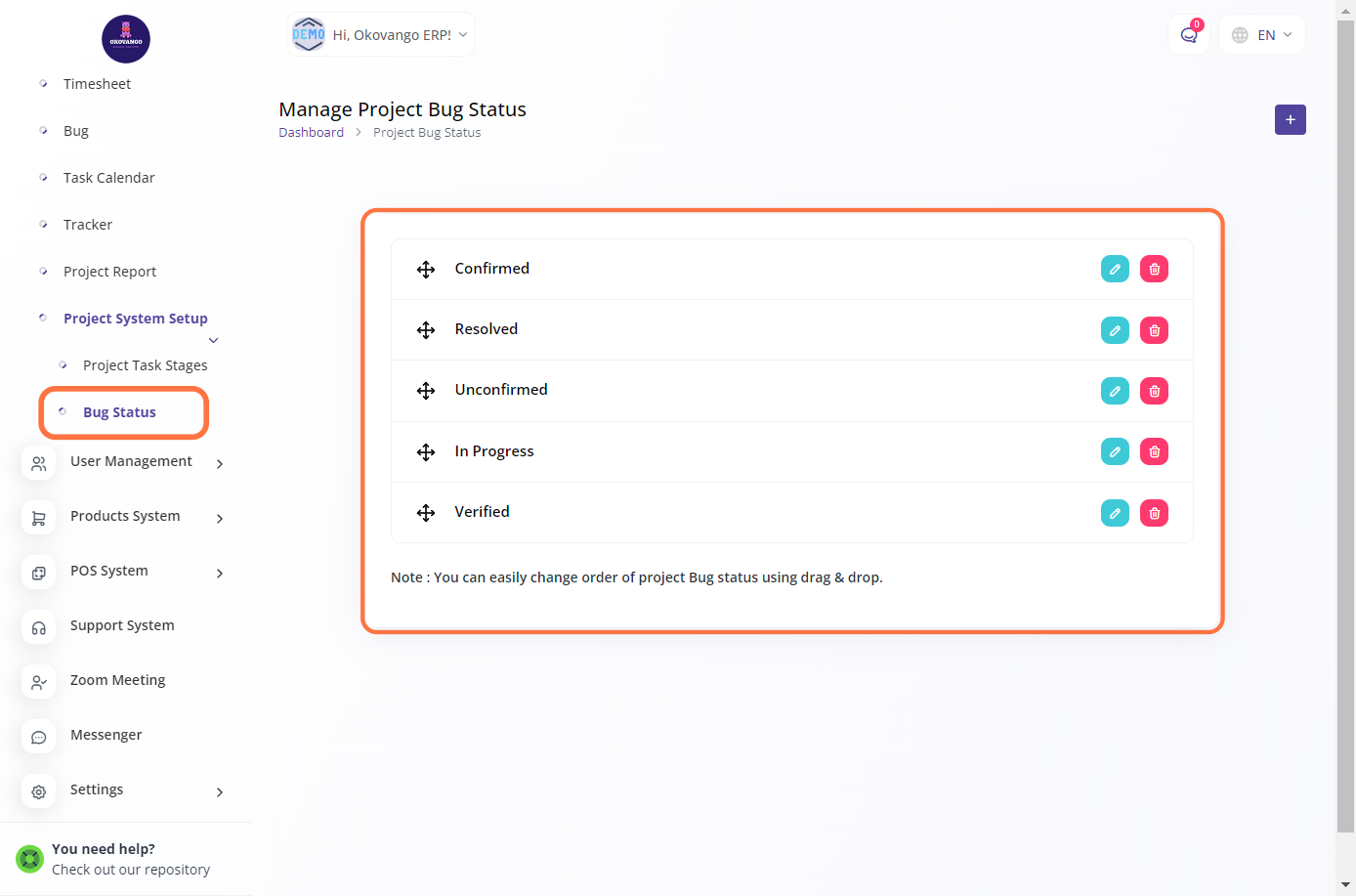 You have the ability to set up bug statuses. Bug statuses help track and manage the progress of reported issues or bugs within a project. You can create different statuses such as "New," "In Progress," "Resolved," or "Closed" to reflect the various stages of bug resolution. This allows you to effectively monitor and communicate the status of bugs, ensuring timely resolution and a smooth project workflow. You can also edit or delete bug statuses as needed to align with your project management requirements.