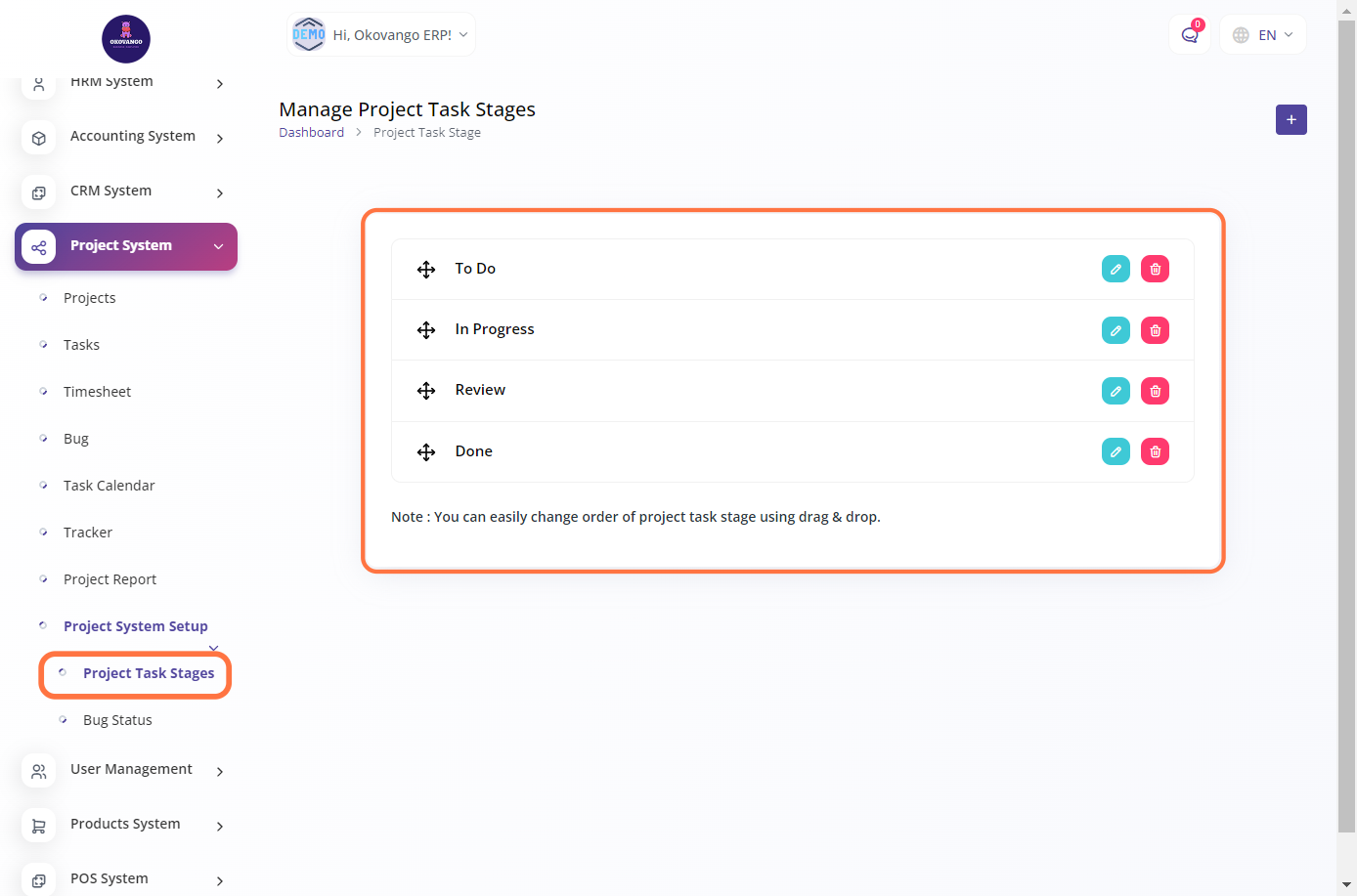 Editing allows you to modify the name or color of an existing task stage to better align with your project requirements. Deleting a task stage removes it from the system, ensuring that it is no longer available for selection or associated with any tasks. These options provide flexibility and customization in managing your project task stages according to your evolving needs.