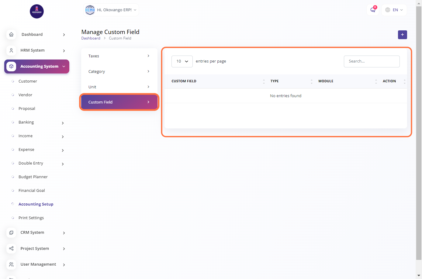 Once you click the create button, you can proceed to set up a custom field in the accounting system using the following steps: