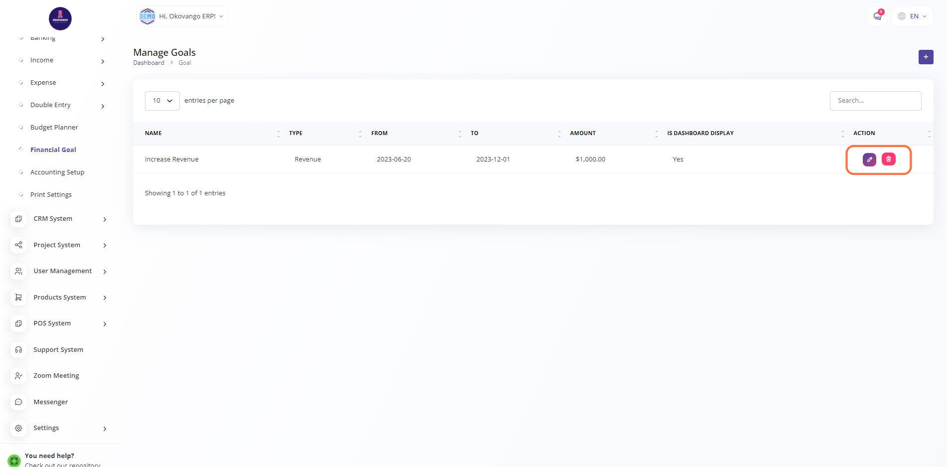 You have the option to edit the existing financial goals by making necessary updates to the name, amount, type, start date, and end date. Additionally, you can also delete any financial goal that is no longer relevant or applicable to your organization's objectives. Editing and deleting financial goals allows you to maintain accurate and up-to-date financial targets and align them with your business priorities.