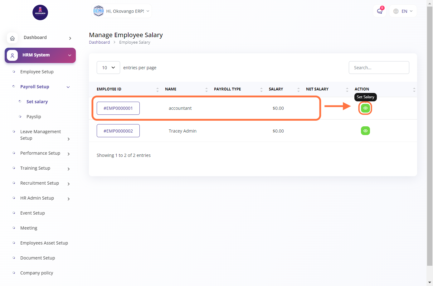 To set up the salary for an employee, you can click on the "Action" button associated with the employee's profile or information.