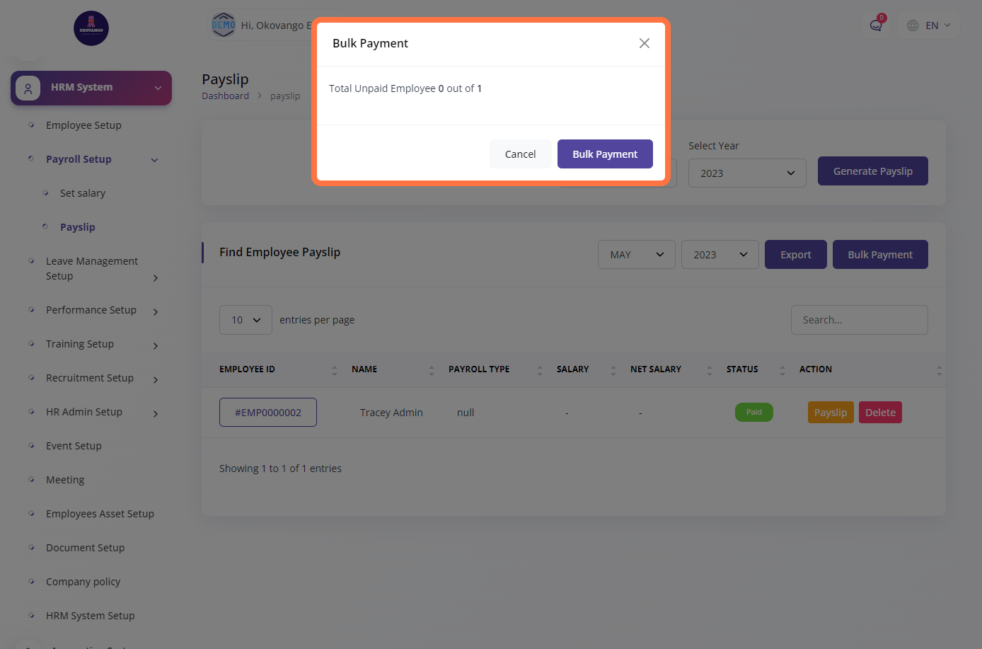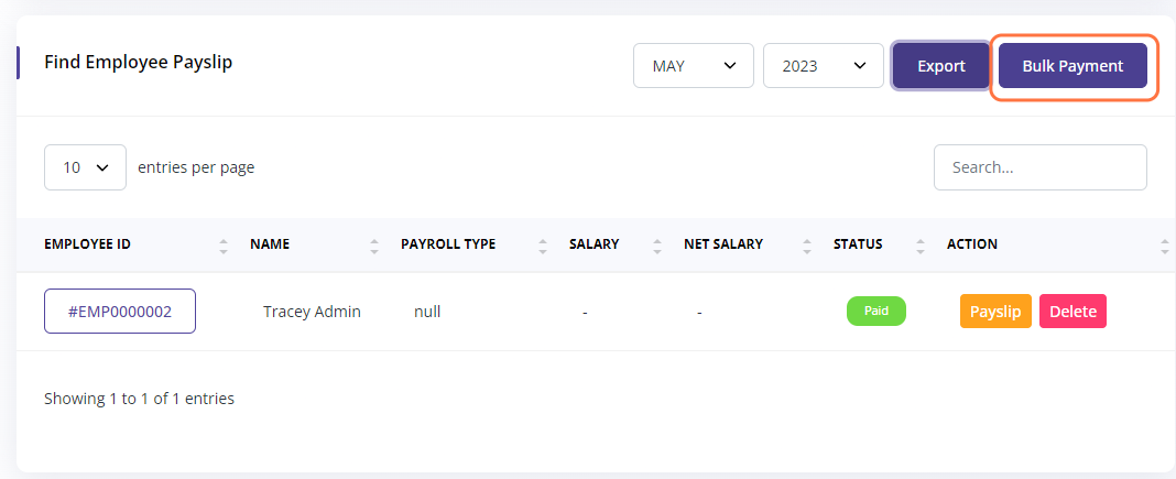 Bulk Payment: In addition, there is the option to perform bulk payment within the payslip management section. This feature allows you to process payments for multiple employees simultaneously, streamlining the payment process and saving time. By selecting the employees for whom you wish to process payments and initiating the bulk payment, you can efficiently handle salary disbursements for a group of employees. This simplifies the payment process and improves overall payroll management efficiency.