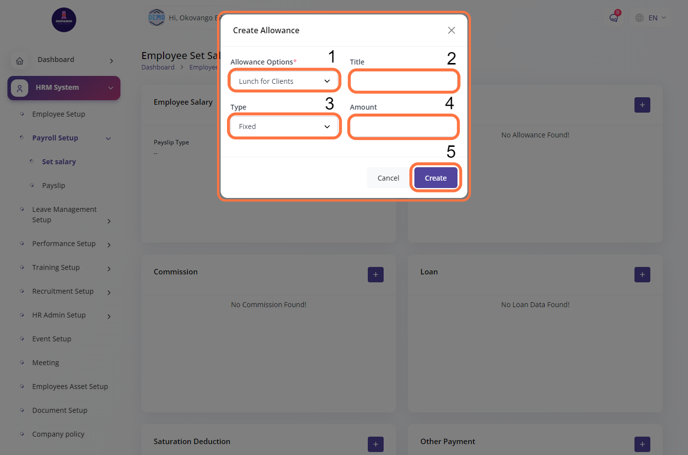 After clicking the create button, you can proceed to set up an allowance by following these steps: