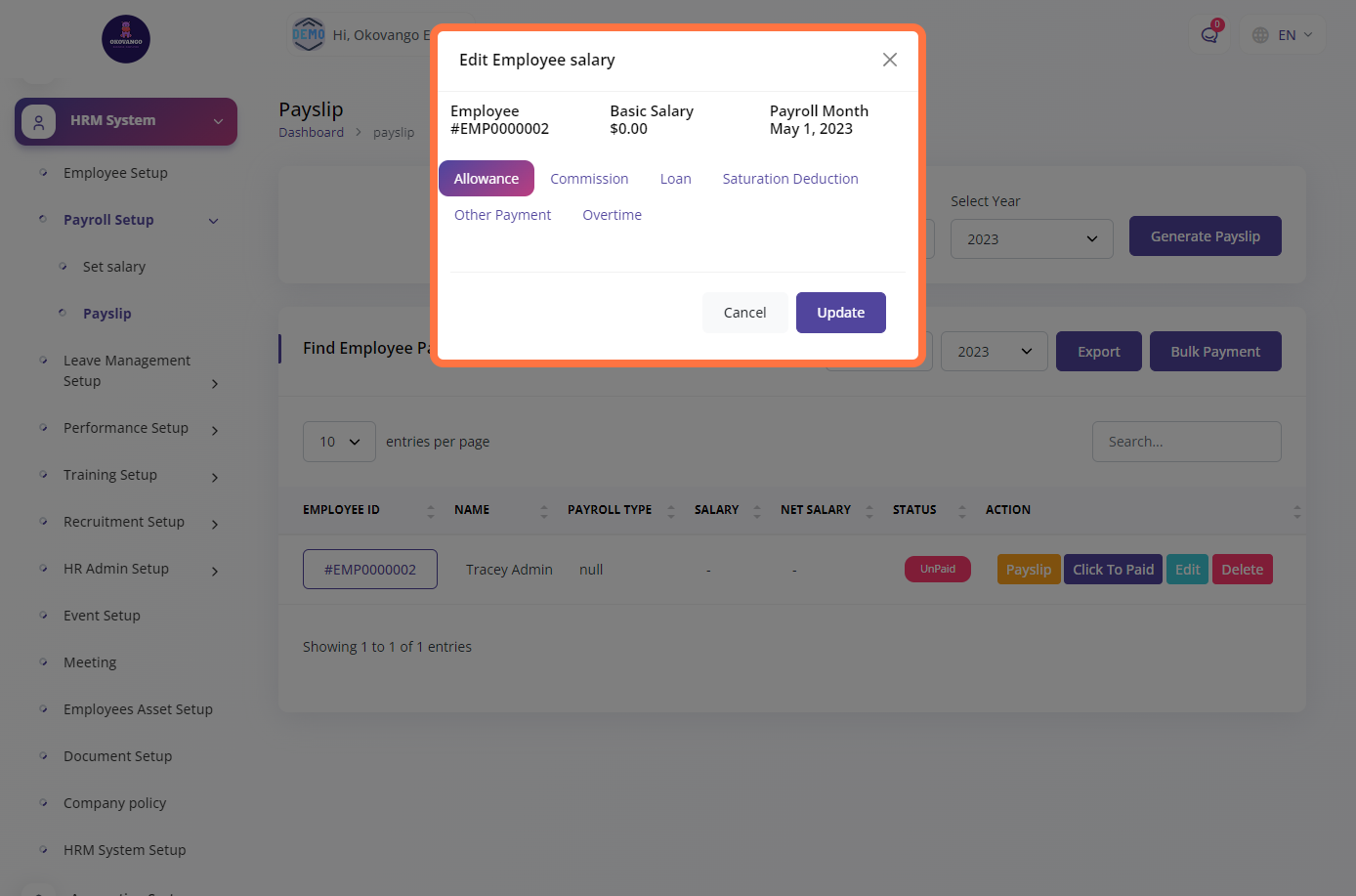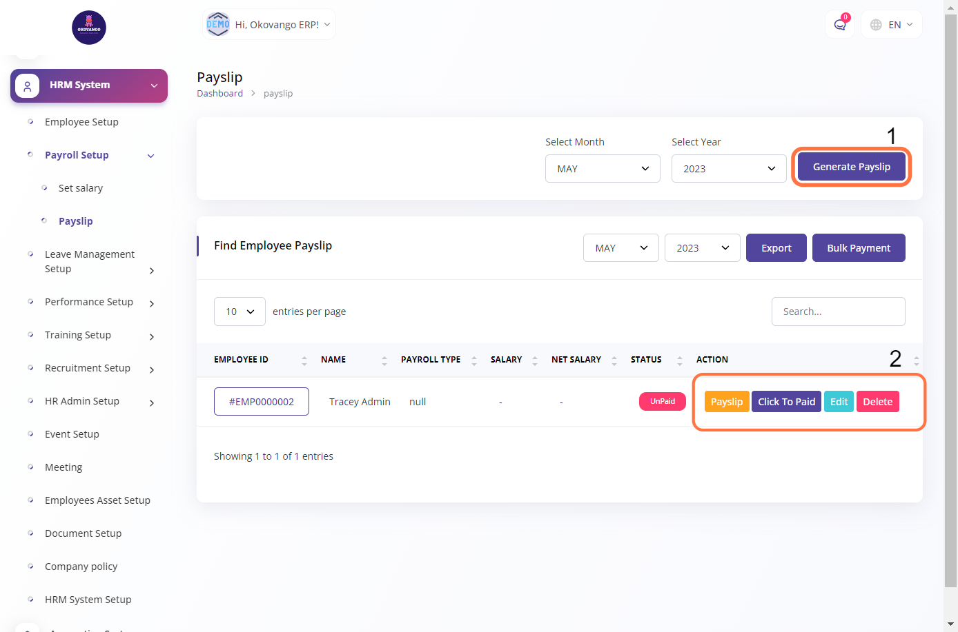 Once you click the "Generate Payslip" button, the name of the employee will appear, and you can perform various actions related to the payslip such as payslip, click to paid, edit and delete