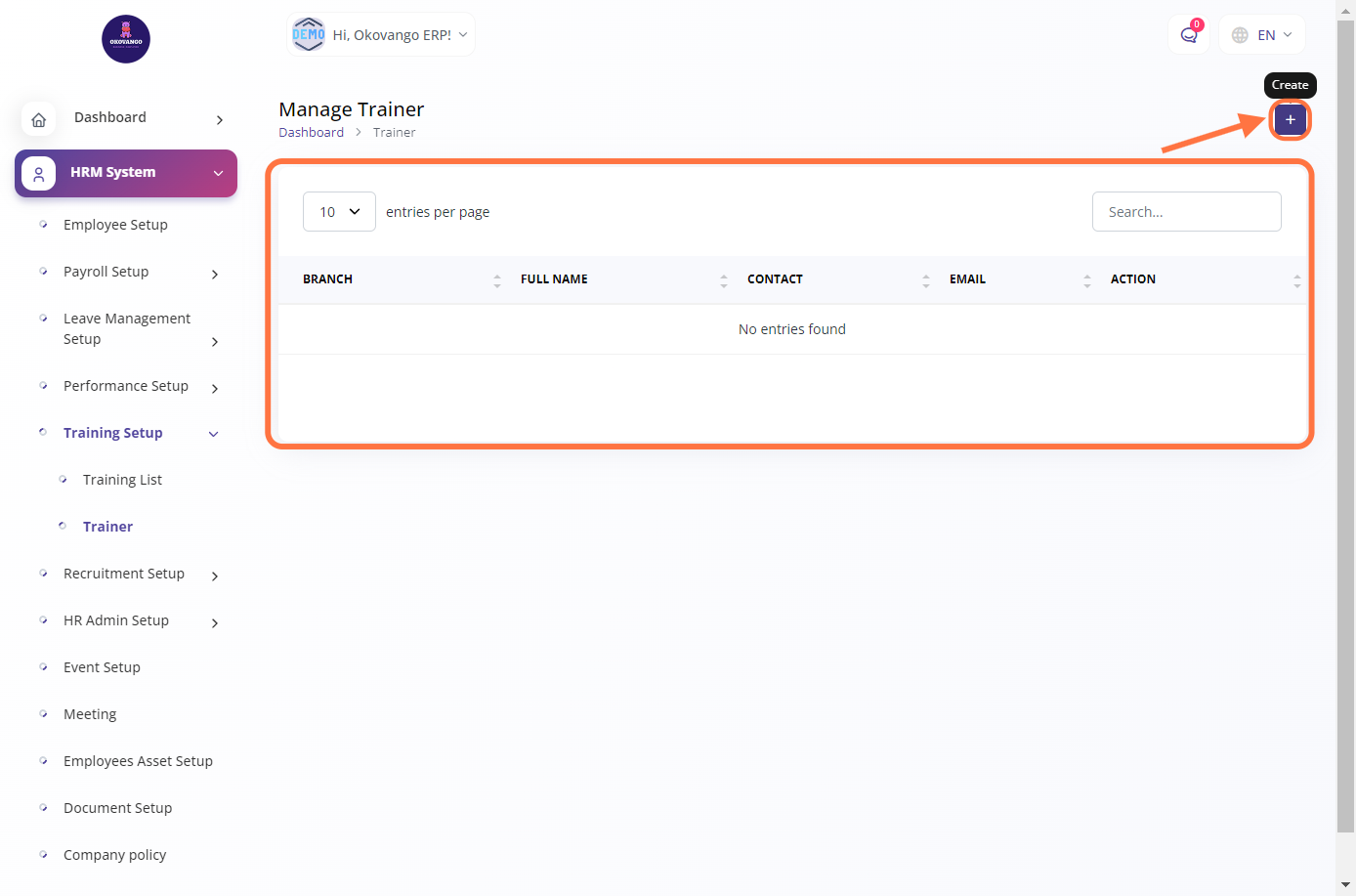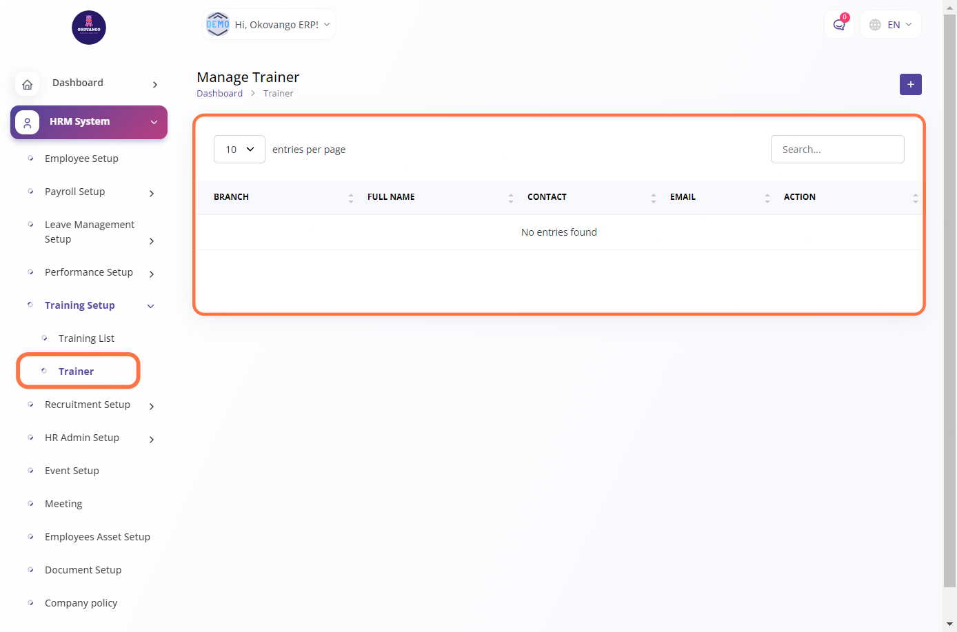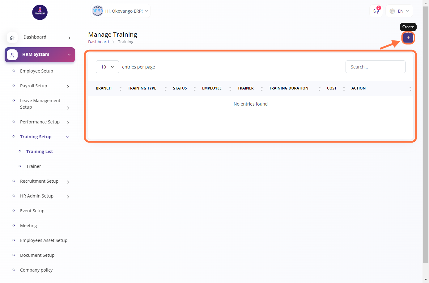 You can set up training programs for employees, including training lists and trainers. You can create a training list to define the specific training courses or programs available within your organization. Additionally, you can assign trainers who will be responsible for delivering the training sessions. This setup ensures that employees have access to the necessary training resources and qualified trainers to enhance their skills and knowledge.