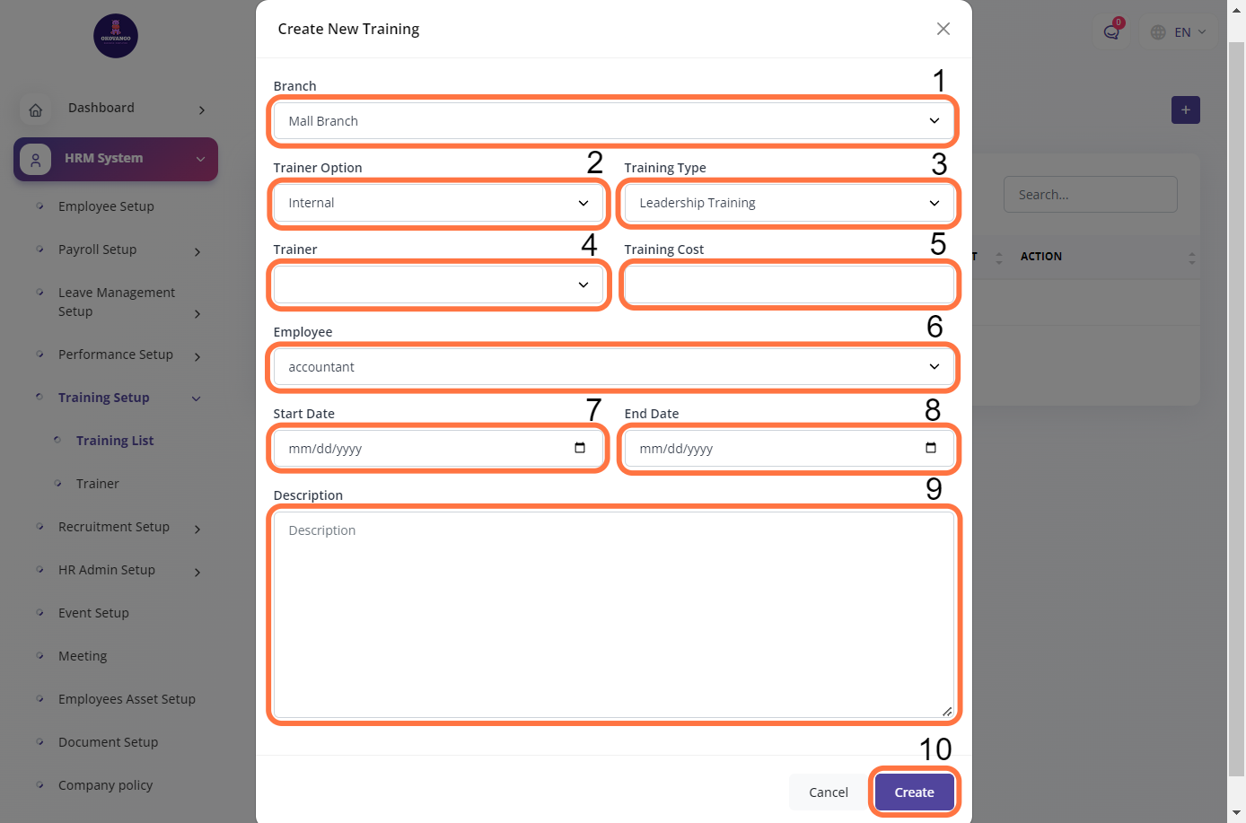 By following these steps, you can effectively set up a training list that includes all the necessary details and parameters for organizing and managing employee training programs within your organization.