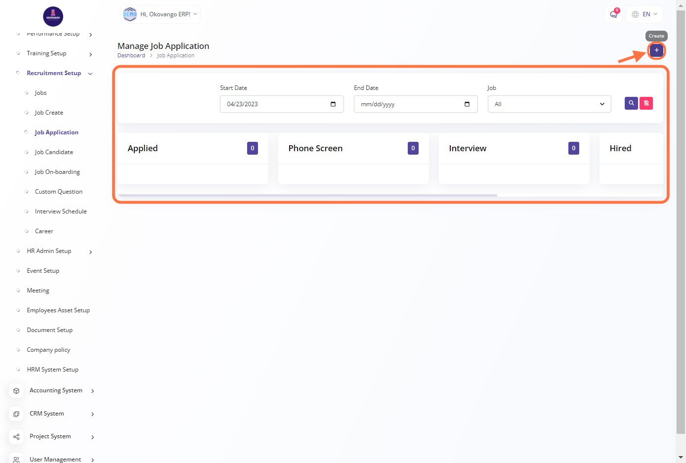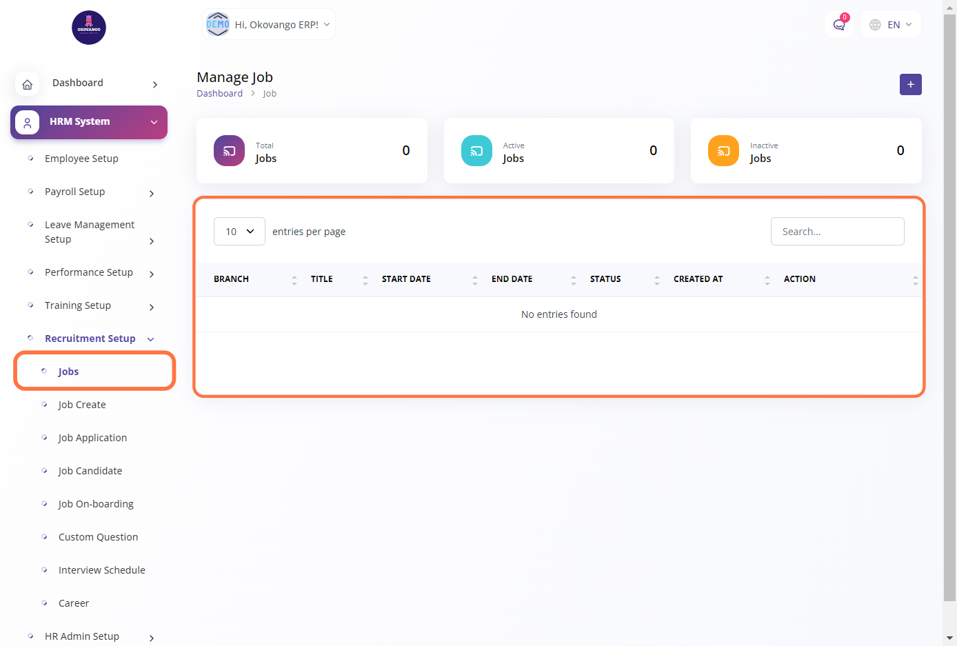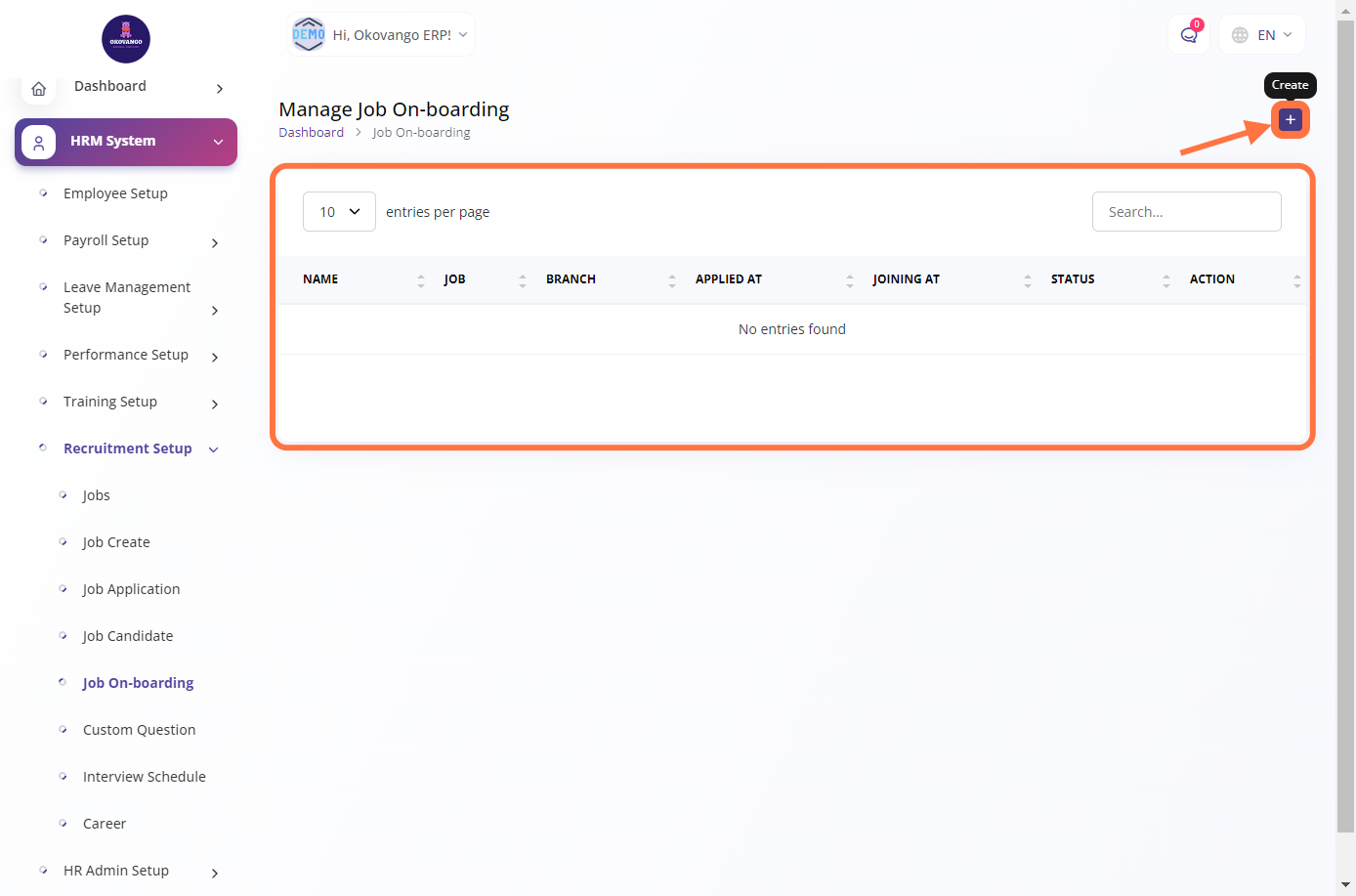 In the recruitment section, you can set up and manage the recruitment process for your organization. This feature allows you to define job positions, create job descriptions, and track the progress of candidates throughout the recruitment process. You can enter details such as jobs, job create, job application, job candidate, job on-boarding, custom question, interview schedule and career. This helps in attracting and selecting suitable candidates for available positions within your organization.