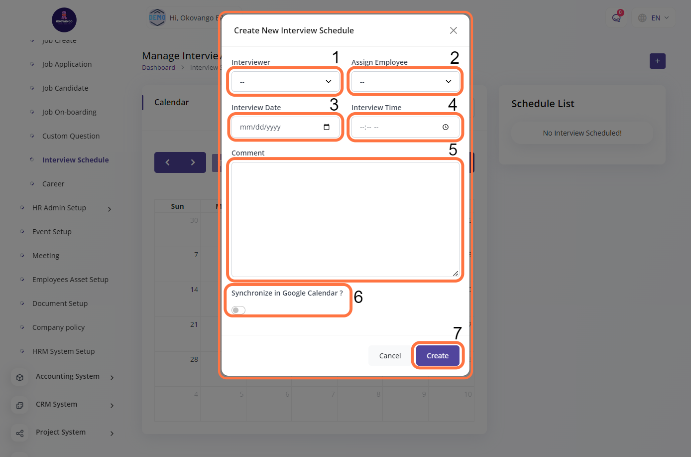After clicking the create button, you can proceed to set up an interview schedule by following these steps: