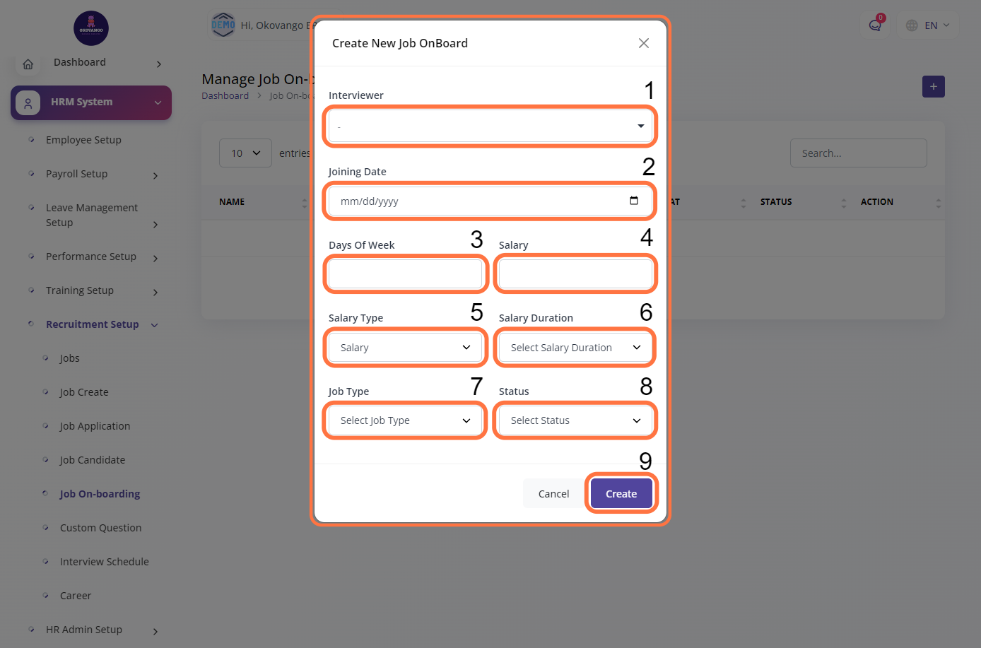 Once you click the create button, you can proceed to set up the job onboarding using the following steps: