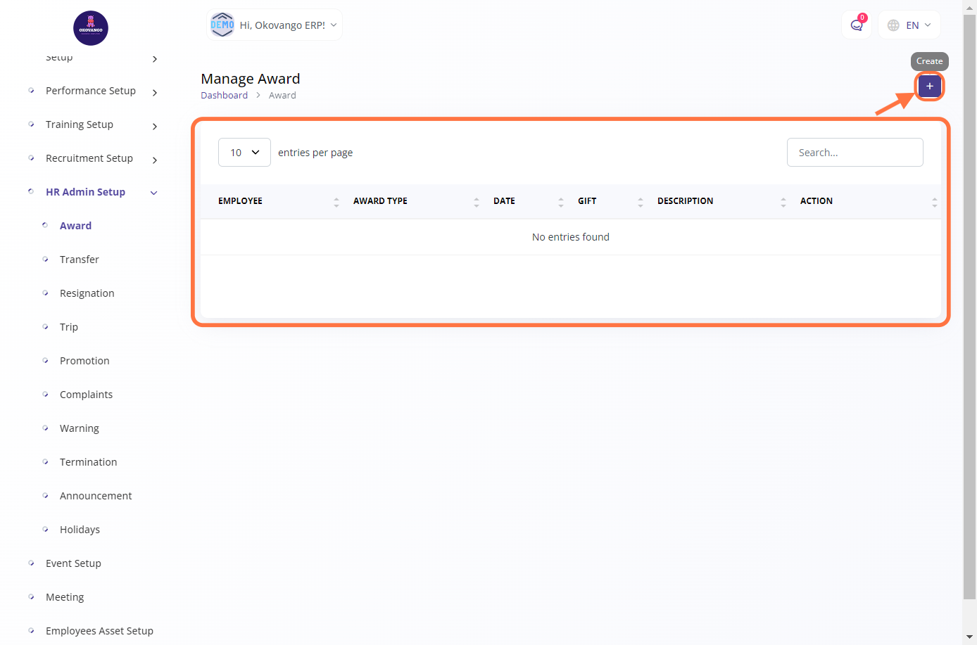 The award setup section allows you to define and configure awards within the organization. It provides a platform to create and manage various types of awards, such as recognition for outstanding performance or achievements. You can set up award criteria, nomination processes, eligibility requirements, and associated rewards or benefits. This feature enables you to streamline the award management process and ensure consistent recognition of employee contributions.
