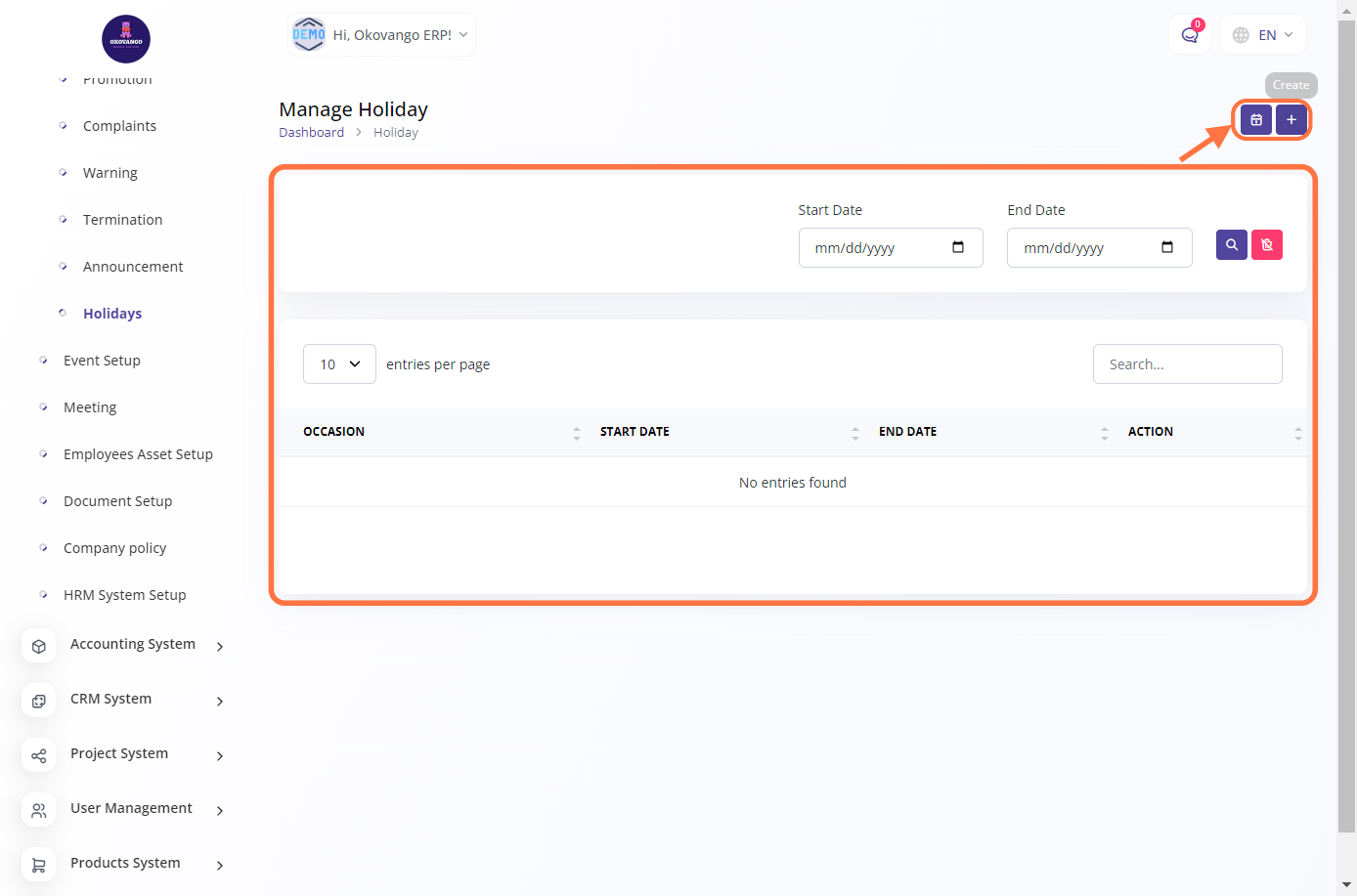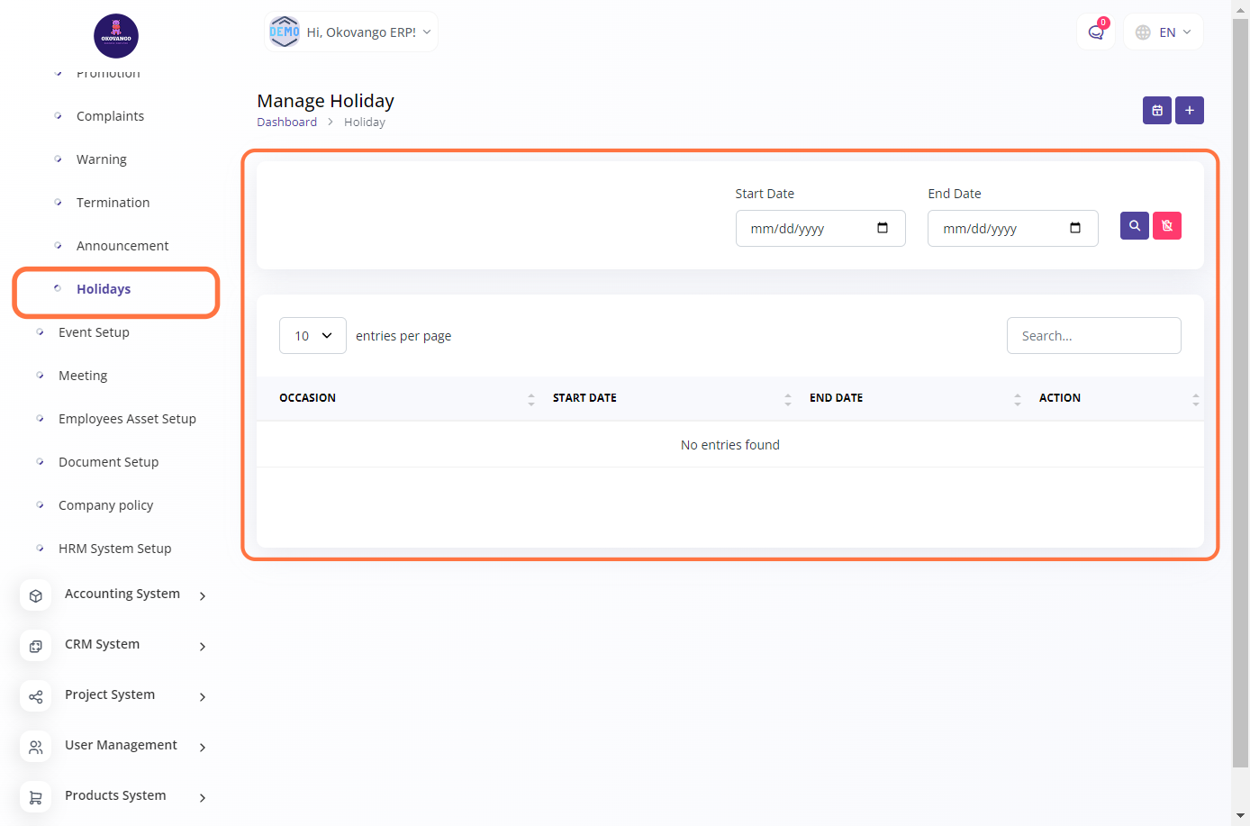In the holidays management section, you can create and manage holidays for your organization. This feature allows you to define the dates on which the organization will be closed or employees will have time off. You can enter the holiday name, specify the holiday date, and provide any additional details or notes related to the holiday. This helps in scheduling and planning, ensuring that employees are aware of upcoming holidays and can plan their time accordingly.