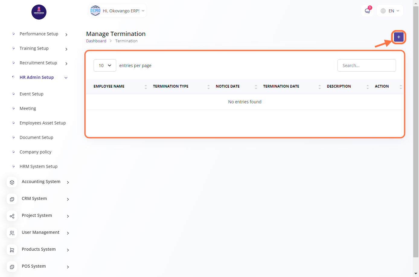 In the termination management section, you can create and manage terminations for employees within the organization. This feature allows you to document and process employee separations, including resignations, layoffs, or dismissals. You can specify the employee who is being terminated, select the termination type, provide a termination date, and include a description or reason for the termination. This helps in maintaining records of employment history, ensuring compliance with legal requirements, and managing the offboarding process effectively.