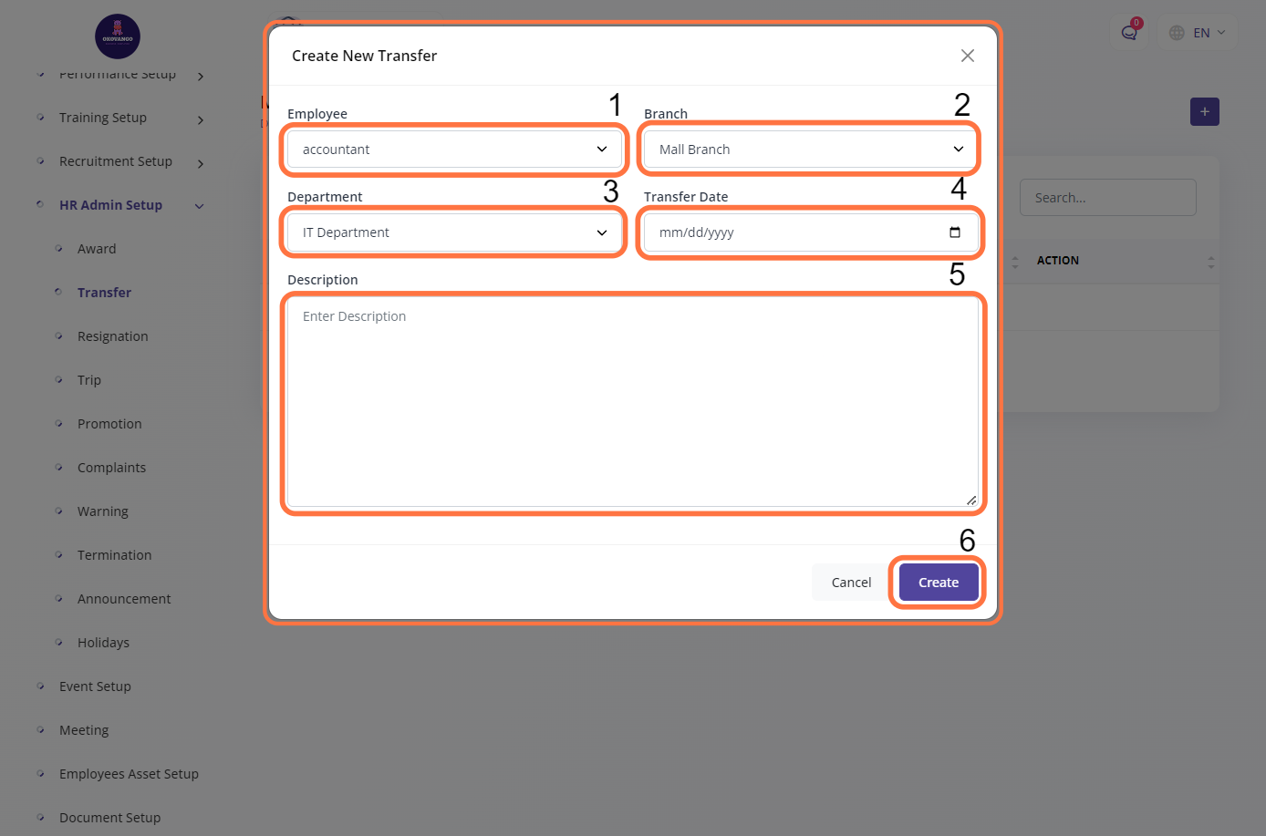 By following these steps, you can effectively set up a transfer, ensuring that the employee is correctly assigned to the desired branch and department, with relevant details such as the transfer date and description.