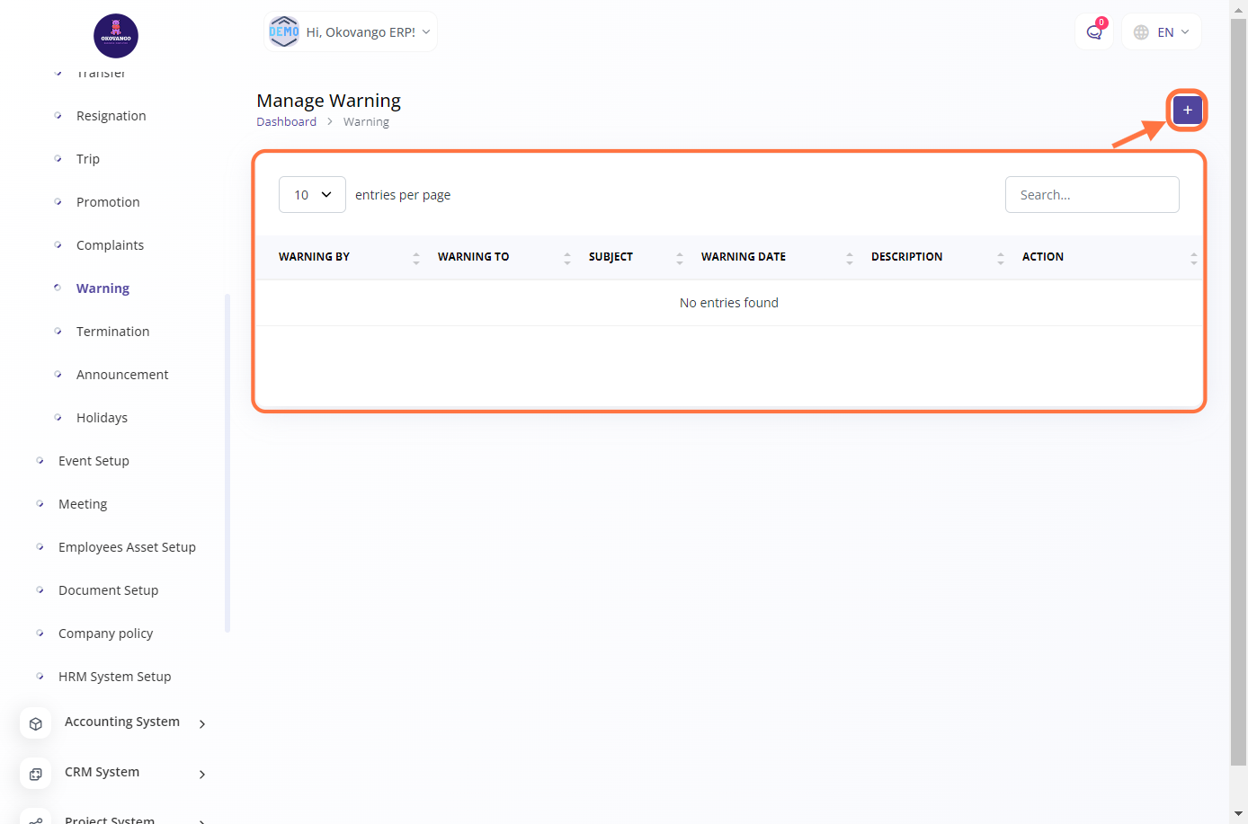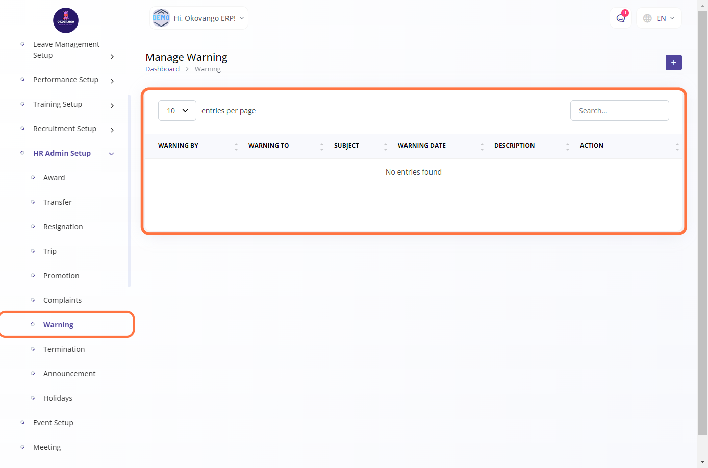 In the warning management section, you can create and manage warnings for employees within the organization. This feature allows you to document instances of misconduct, poor performance, or policy violations. You can specify the employee who is receiving the warning, select the type or category of the warning, provide a description of the incident or behavior, and set the warning date. This helps in maintaining disciplinary records, promoting accountability, and ensuring adherence to organizational policies and standards.
