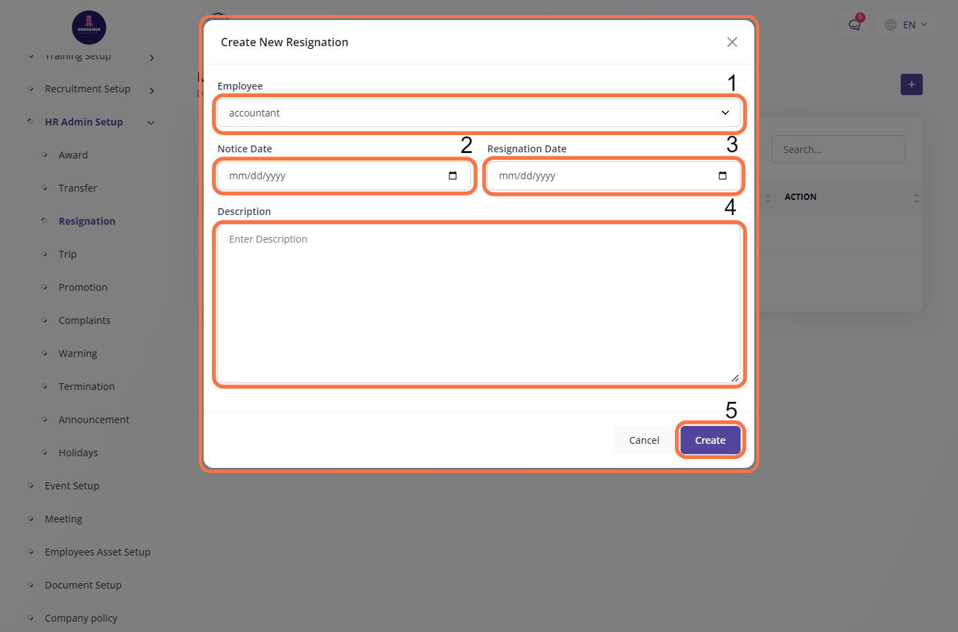 After clicking the create button, you can proceed to set up a resignation using the following steps: