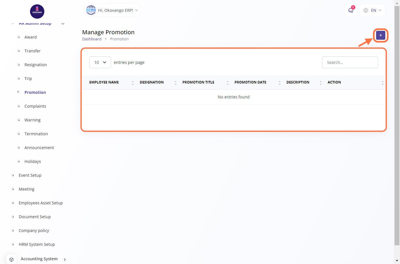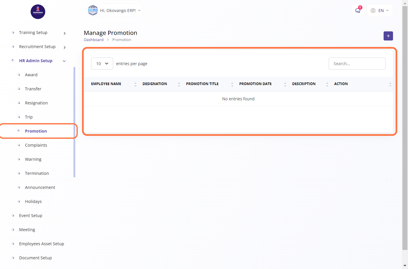 By following these steps, you can effectively set up a promotion, ensuring that the employee's new position, designation, and promotion details are accurately recorded, with relevant information such as the promotion title, promotion date, and description.