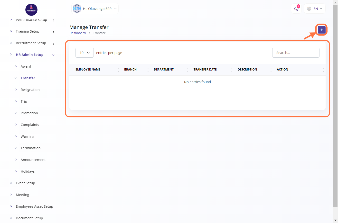 The transfer management section allows you to handle employee transfers within the organization. It provides a platform to initiate, track, and manage employee movements between different departments, branches, or locations. You can easily process transfer requests, update employee records, and ensure smooth transitions. This feature streamlines the transfer process and facilitates effective communication and coordination between departments and HR administrators.