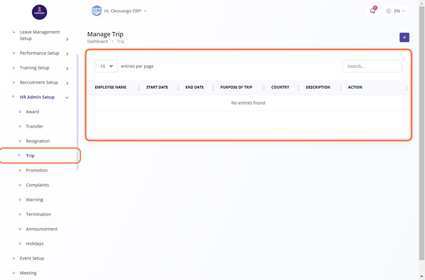 The trip management section allows you to handle employee trips or business travels within the organization. It provides a platform to manage and track trip requests, approvals, and associated details. You can enter trip information such as destination, purpose, duration, and expenses. This feature helps streamline the trip management process, ensures compliance with travel policies, and facilitates efficient coordination between employees and the HR department.