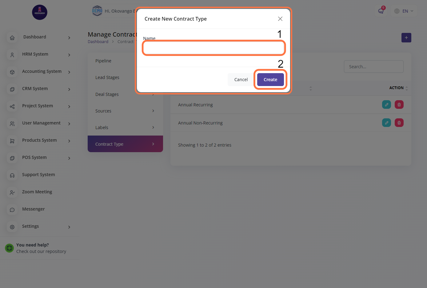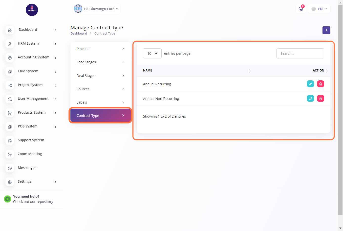 Once you have created a contract type, you have the flexibility to edit or delete it as needed. Editing the contract type allows you to modify its name or any other relevant details. This ensures that you can update the contract type information to accurately reflect your organization's evolving needs. Deleting a contract type removes it from the system, providing a way to remove outdated or no longer applicable contract types from your CRM setup. The ability to edit and delete contract types gives you control over managing and maintaining a streamlined and relevant contract type list in your CRM system.