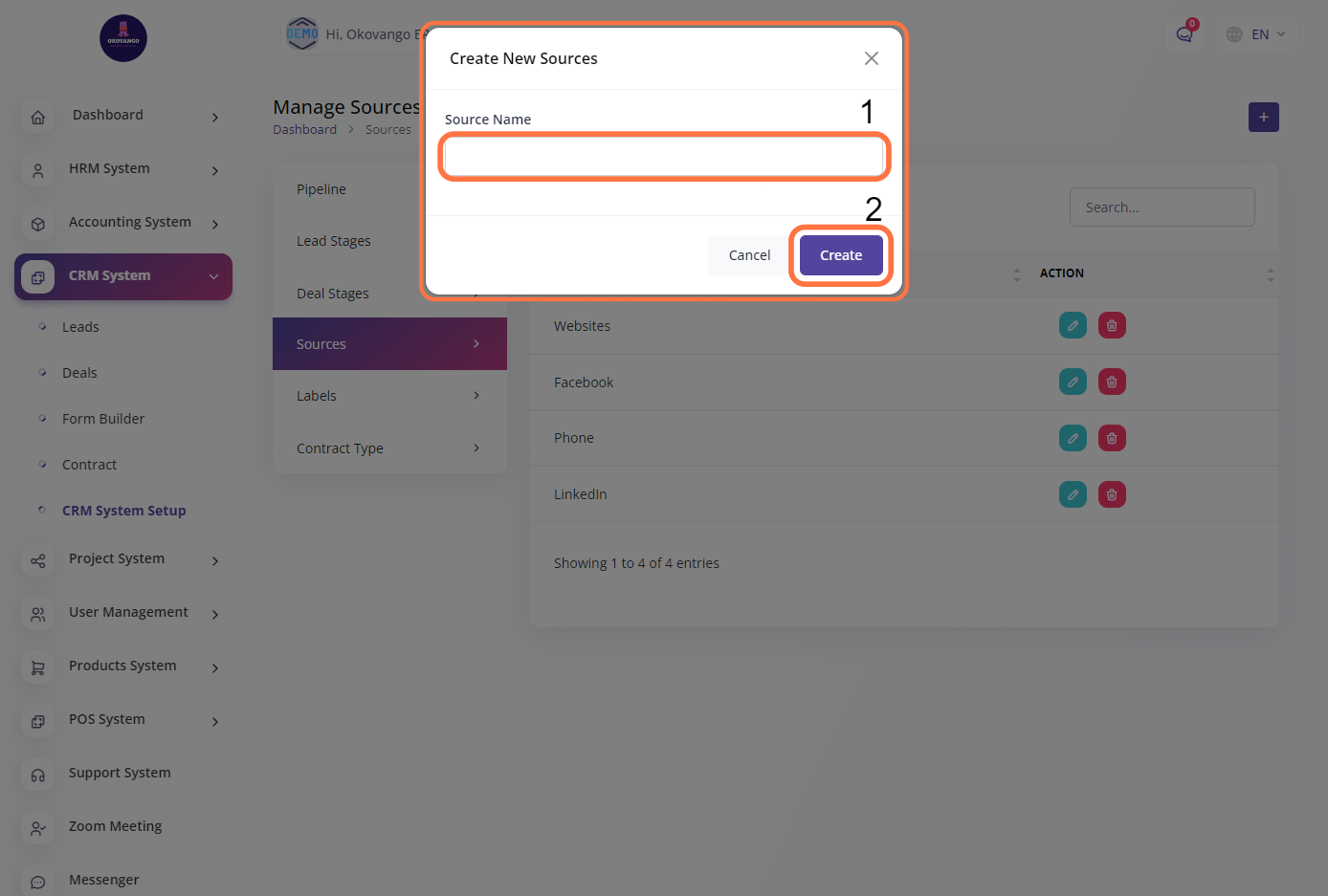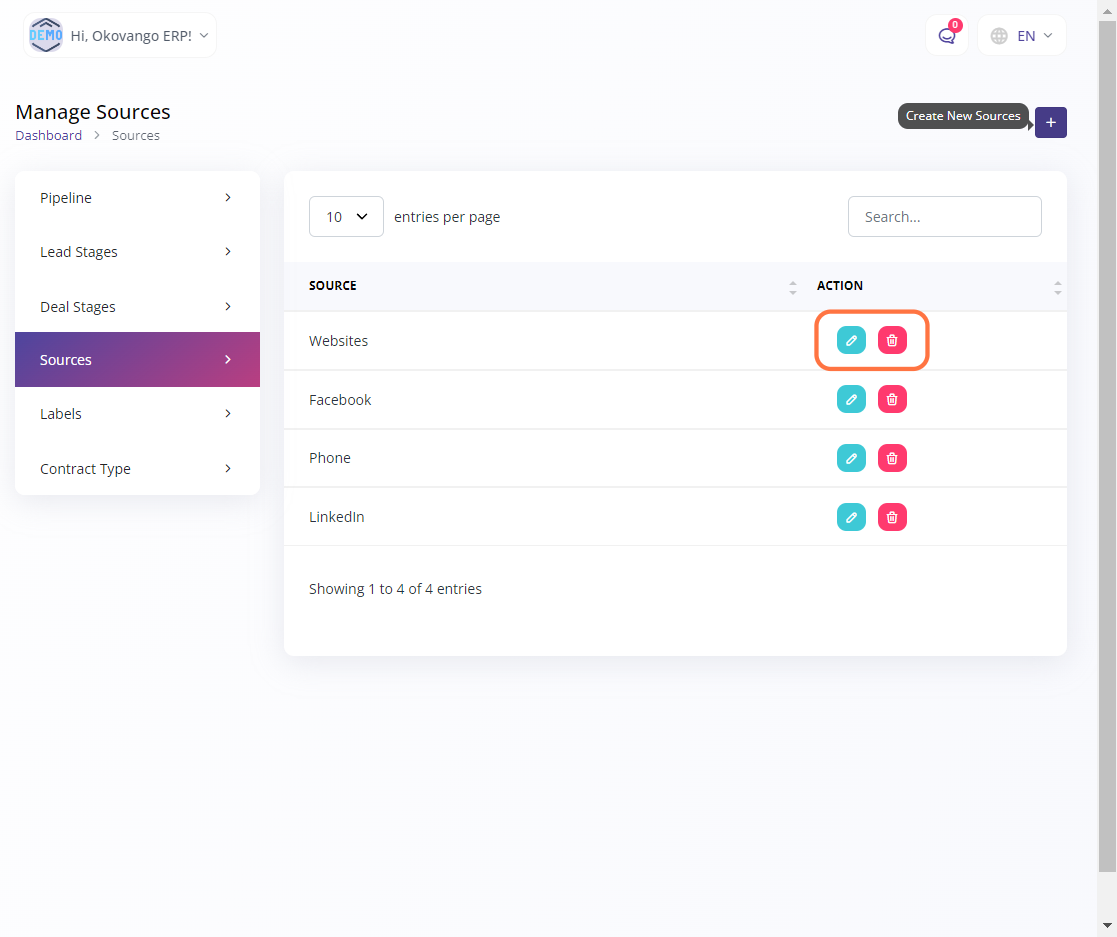 In this section, you can configure and manage CRM sources. CRM sources refer to the different channels or platforms through which your organization acquires leads or potential customers. By setting up CRM sources, you can categorize and track the origin of your leads, helping you analyze the effectiveness of various marketing and sales channels. This feature allows you to efficiently manage and evaluate the performance of different lead generation sources, enabling you to make informed decisions and optimize your marketing and sales strategies.