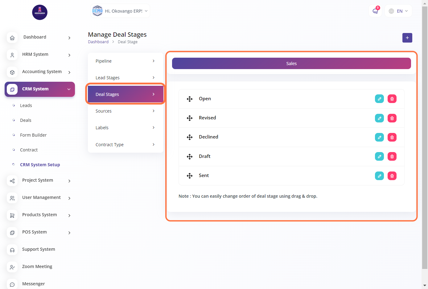 - Additionally, you have the flexibility to easily rearrange the order of deal stages by using the drag and drop feature. This allows you to customize the sequence of deal stages based on your specific workflow or business requirements.