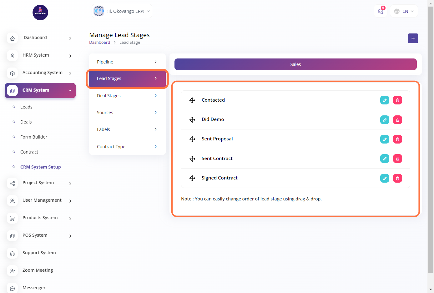 - Please note that you can also easily change the order of lead stages by using the drag and drop functionality, allowing you to rearrange the stages according to your preferred sequence.